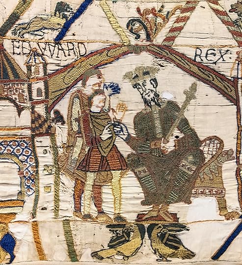 Edward the Confessor enthroned at Westminster Abbey, as recorded in the Bayeux TapestryThe idea that the Crown jewels of England could ever have been destroyed seems almost unthinkable. Anyone who has seen the present collection behind thick glass in the Jewel House of The Tower of London, watched over by the loyal Yeoman Warders, will undoubtedly acknowledge that there is something unique about them, as if their very appearance is inseparable from that of the monarch, including the kings and queens of the past. The term Crown jewels is itself worthy of further explanation. The term incorporates every item connected with the ceremony from metal to vestments, not merely the crown. Coronation regalia has always played a vital and, at times, dramatic part in England’s history. As recently as 1988, archaeologists discovered crowns from the 2nd century BC. Similar finds have also been recorded from the Saxon era.