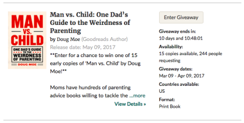 Well lookee here, @abramsbooks has put up a giveaway for my book Man Vs. Child on Goodreads - If you are cheap, but literate, you should enter!