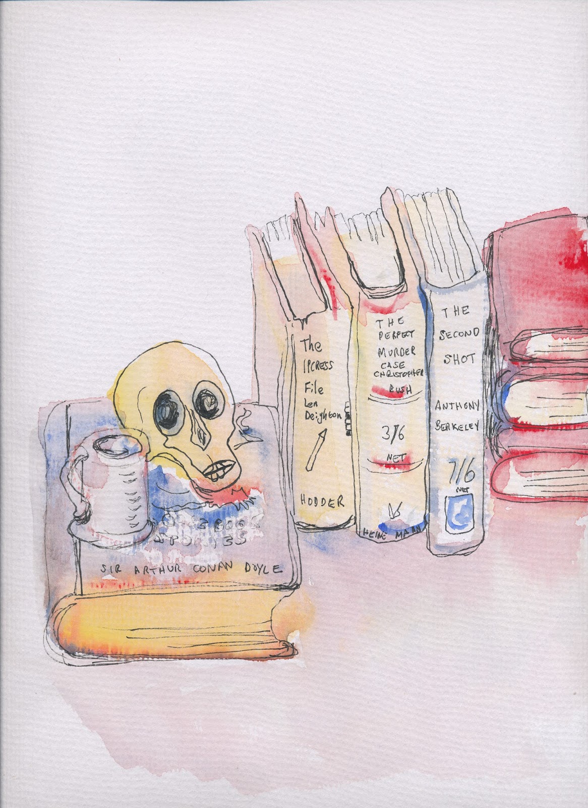 As well as being a very occasional crime writer, with two published stories to her credit, Mrs Edwards is also an accomplished artist, and she too was impressed with the Christie print. There is something very attractive about old books in good condition, and they make appealing and rather unusual subjects for paintings. So she has set about producing a few of her own devising - an example is above - and at least there is no shortage of old books in the Edwards household to appear in her works.