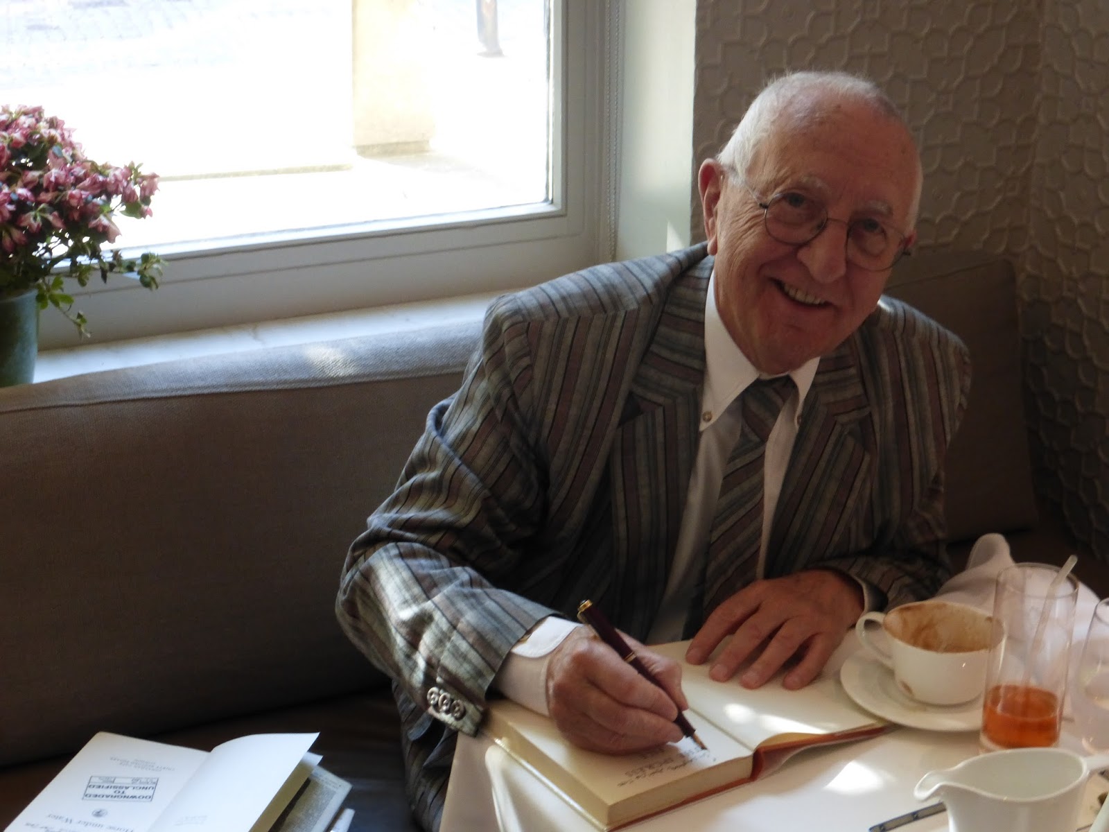 Two lunches stand out in my memory because they were spent in the company of two men I admired as a teenager and have continued to admire ever since. The legendary Len Deighton invited me to Koffman's, and treated me to three hours of fascinating anecdotes about his life and career. Incredibly kind and truly unforgettable. The photo above shows Len in the process of inscribing his first four books to me. Peter Gibbs, playwright, novelist, and former Derbyshire cricketer took me to Vincent's Club in Oxford, and we spent the day together, revisiting old haunts. I also had the pleasure of meeting for the first time Simon Curtis, director of My Week with Marilyn, who invited me for coffee at the Ivy Club - my first visit there - and a chat about Golden Age books..