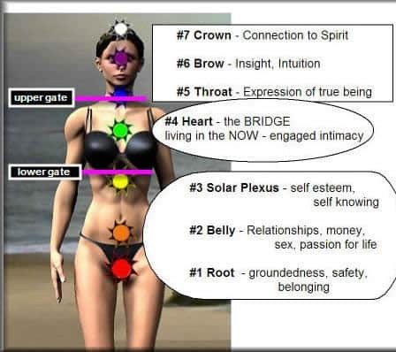 This transition requires the use of 5,6,7The throat — which stands for the release of true self into the world, metaphorically through speech, is actually about expressing the totality of one’s being.The Third Eye — Insight — intuition, and the ability to see what’s really going on.Transcendence — satori, enlightenment, etc.If there is a block at the shoulder diaphragm, getting past it requires actualizing the first 4. The work is to assimilate the 1,2,3, (physical zone,) with the heart (4), so that all physical being and acting is done out of compassion.