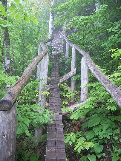 [image error]Maybe it was a good thing the fog stayed thick throughout my hike. The warning signs at either end of the Jordan Cliffs Trail is well warranted. There was plenty of exposed rock ledges, cliff scrambles, and iron rungs to scale. I have no idea how far down the drop was, but the tops of the trees were lost in the fog.