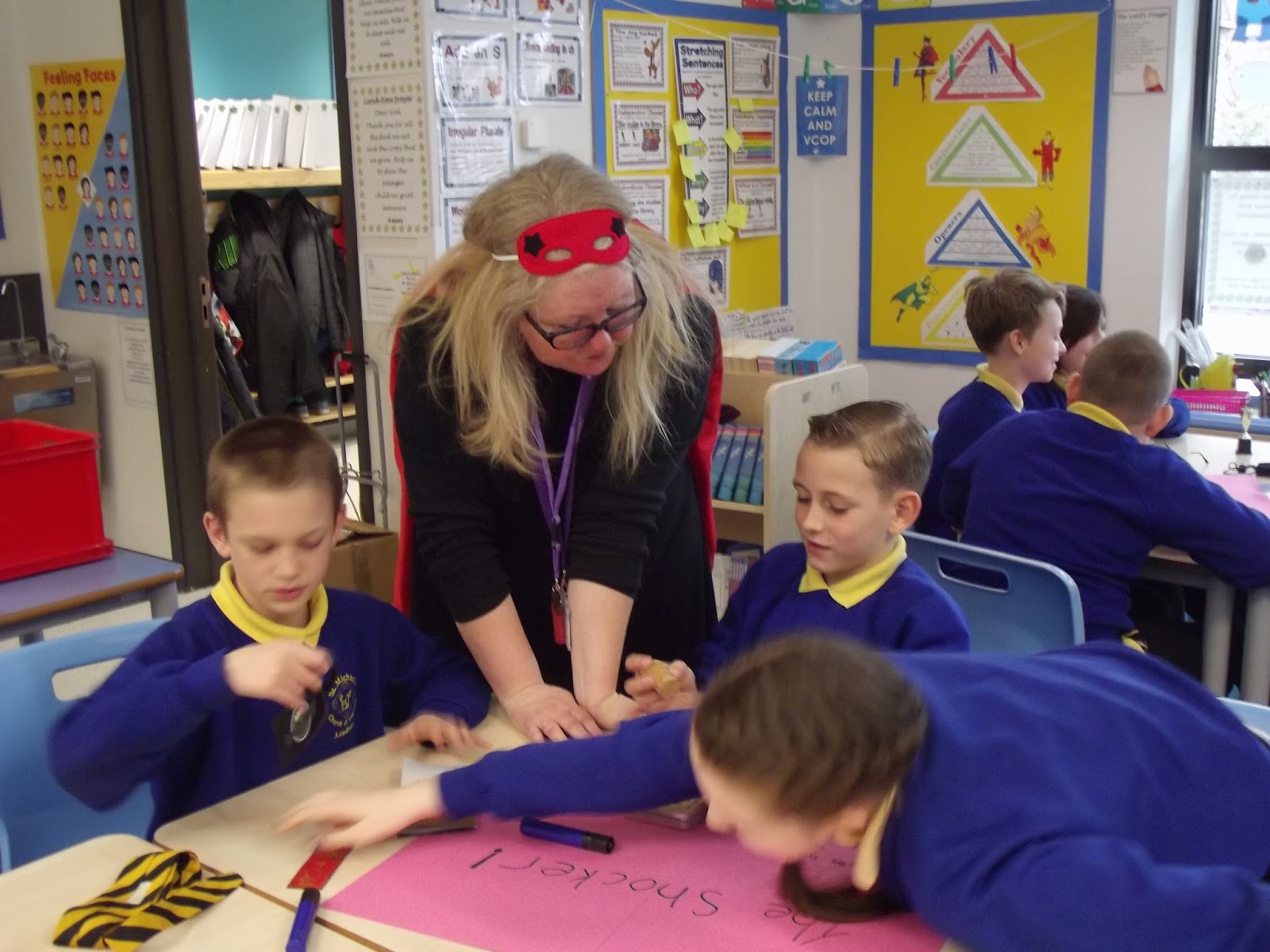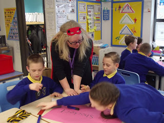 After the talk, we moved into classrooms where the workshops would take place. During these sessions the children created a superhero who would help the tooth fairies in my books fight back against their enemies, the Grublins. Each group of four/five had a bag of props to help them determine what to use for their character.