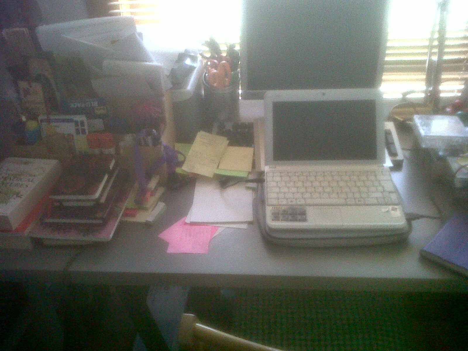 Alas, the great ordering of said shelves cannot be applied to my new desk set up. I seem to accumulate so many notebooks, post-it notes, book marks, scissors, pens etc. I'm sure they breed while I sleep. The upside is that the desk now looks out over the front garden, providing a much nicer view than the wall I had in the old study. The chair is still the old uncomfortable one, but I write more if I am not too settled and that chair definitely keeps me on edge.