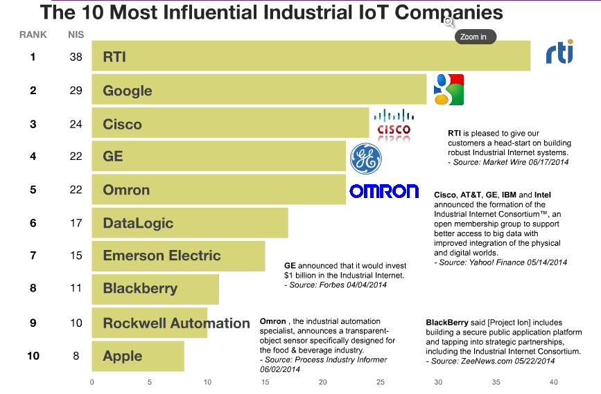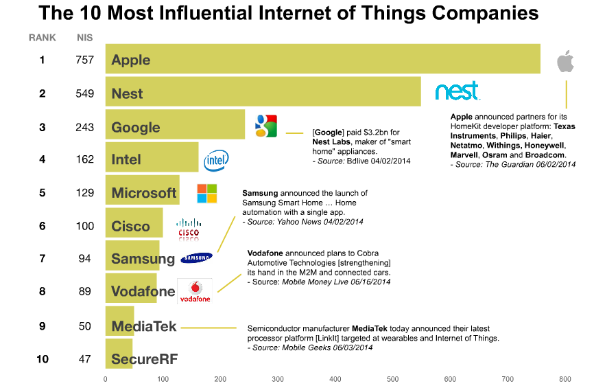 The internet of things is still a very big area of discussion and exploration. The folks over at Appinions (an influencer marketing platform) put together an interesting list of companies that are having a huge impact on the internet of things industry. Based on their scoring system here is what they came up with.