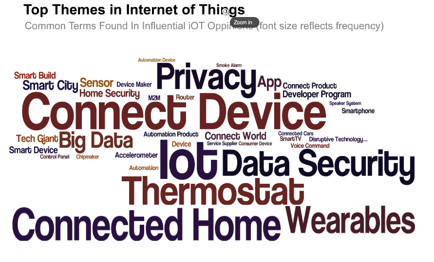 The most interesting thing however is what people are discussing when they are mentioned the internet of things. Appinions put together a nifty little tag cloud for that as well. It should come as no surprise that words like privacy, data security, and big data, are among the most common themes.