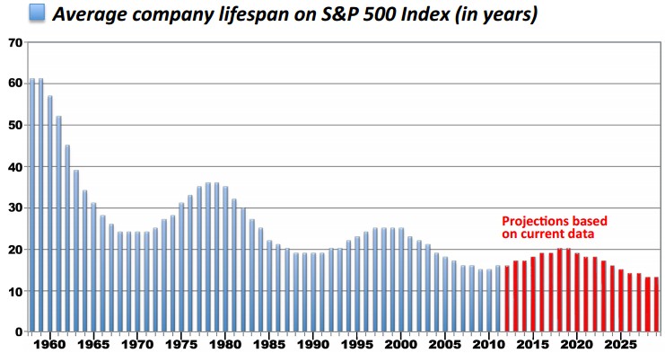 What about the fact that the average life expectancy of a company on the S&P 500 used to be 75 years. Today that number is just barely 15 years. Research shows that by the year 2027, 75% of the companies on the S&P 500 will be replaced. Take a look at the chart below from Innosight to see the trend.