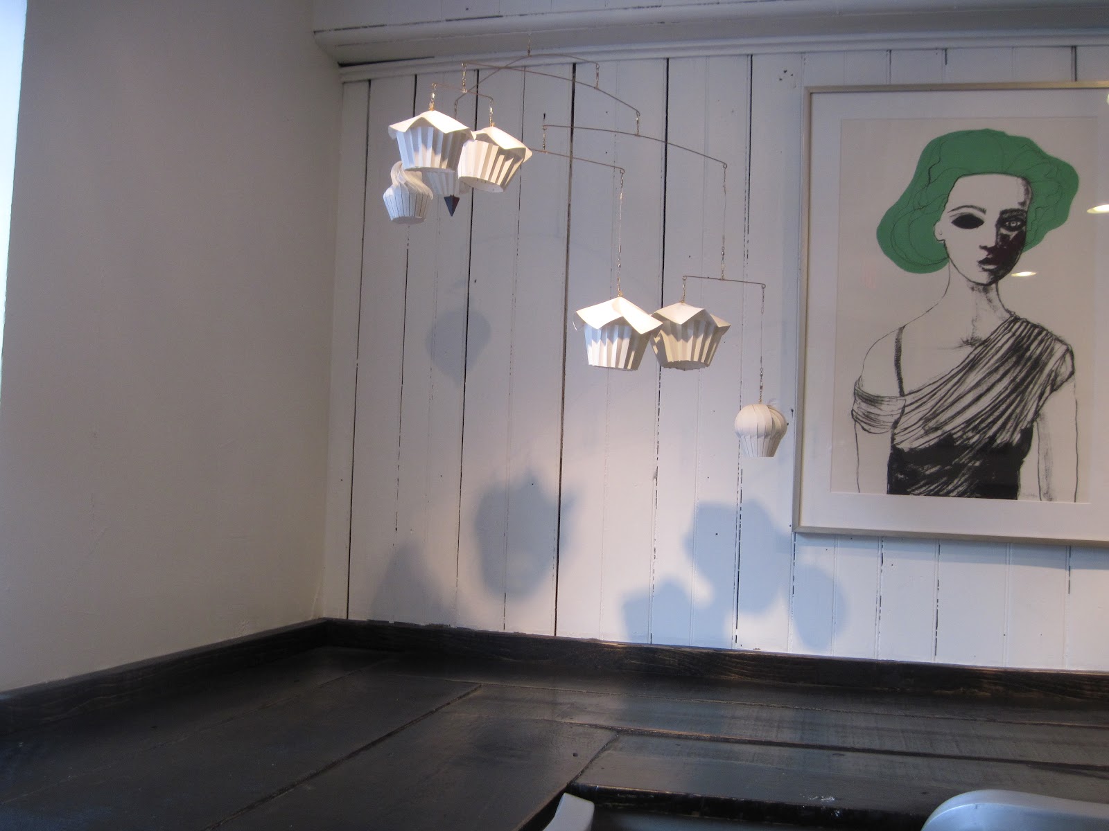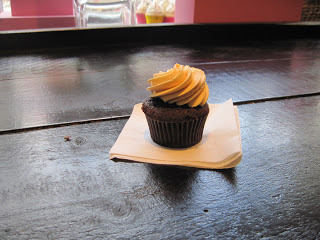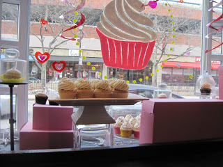 There's a cupcake shop. A pink cake is painted on the window, and there are glass stands of lavishly decorated cakes. I pushed the old door and walked inside. The place was techno bare. A chic girl stood at the counter. She had short dark hair, skinny arms, and a low scooped top.