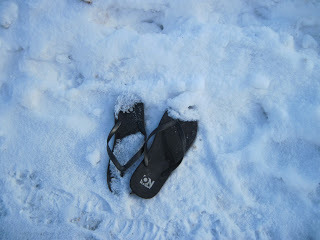 It was noon, but I didn't see any students. There were several other adults walking dogs. No students, just random sandals in the snow.