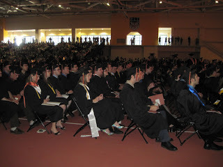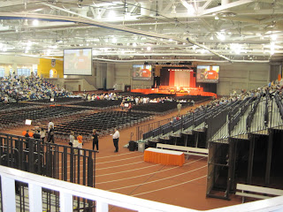 My son graduated from the Rochester (NY) Institute of Technology (RIT) last weekend: a bachelor's degree in mechanical engineering. I went to the graduation ceremony. It was held in a sports arena, an enormous structure, like a football stadium I guess. It could certainly accommodate thousands of people.