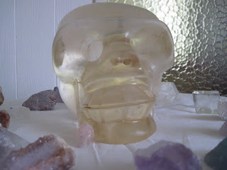 The skull had a yellow tint with cloudy white inclusions and 3 small black areas that looked like gnats trapped in amber. Skully was life-sized and heavy. Even though it was mostly hollow, with deep eye sockets and a cylindrical space in the center, it was heavy enough on my legs that I worried about capillary compression.