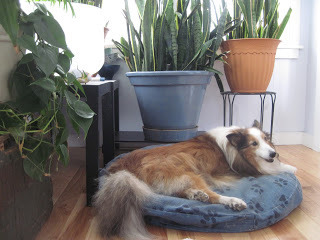Then I went to visit my friends Betsy & Dave. I love their house: so warm and comfy. It's all wood floors and walls, Persian carpets, comfy sofas, a wall of plants, a ceiling of baskets, cats & dogs, and my good friends. While I ate a last piece of Thanksgiving apple pie, Betsy made Fluff a scrambled egg on toast and Fluff ate most of it.