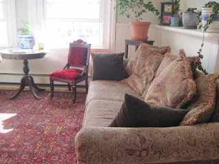 Friend of a friend, she showed us her workplace. We skipped up three flights of stairs. At the bottom was a faded painted sign. The stairs were wide, wood, polished and clean. The ceilings were high, the space pulled me up. We got to the top and removed our shoes. The floors were old, stripped and sealed anew. We saw the yoga space, the dark massage room with loft, and then the common room. Yeah, the common room? The wooden floor, red oriental rug, big couch, plants, ... but the windows. The ceiling was 15 or 20 feet high, and the windows floor to ceiling with wide arches at the top, surrounded by layers and rings of woodwork. Sun poured in. Views of rooftops, trees, buildings, and parking garages. Trees and the river? Not sure.
