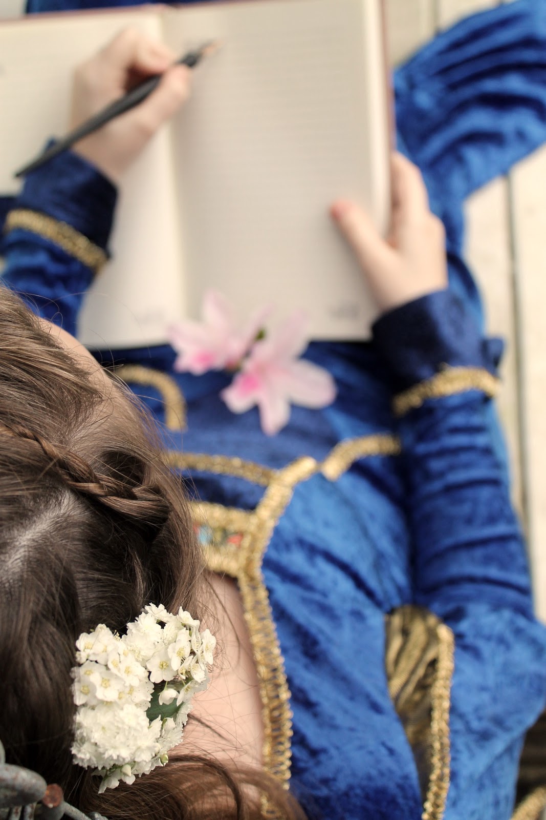 The Wood Thrush's Song: For the first time in this chapter, Una really hears the wood thrush singing. And when she hears it, she suddenly has ideas for a poem, which she hastily writes down. Did this poem spring from inside her, or is she merely putting the wood thrush's song into her own language? I think the latter. And keep watching as the book progresses . . . the wood thrush's song is going to return and develop.Here's a fun fan art image! The beautiful Clara posing as Princess Una, composing poetry.