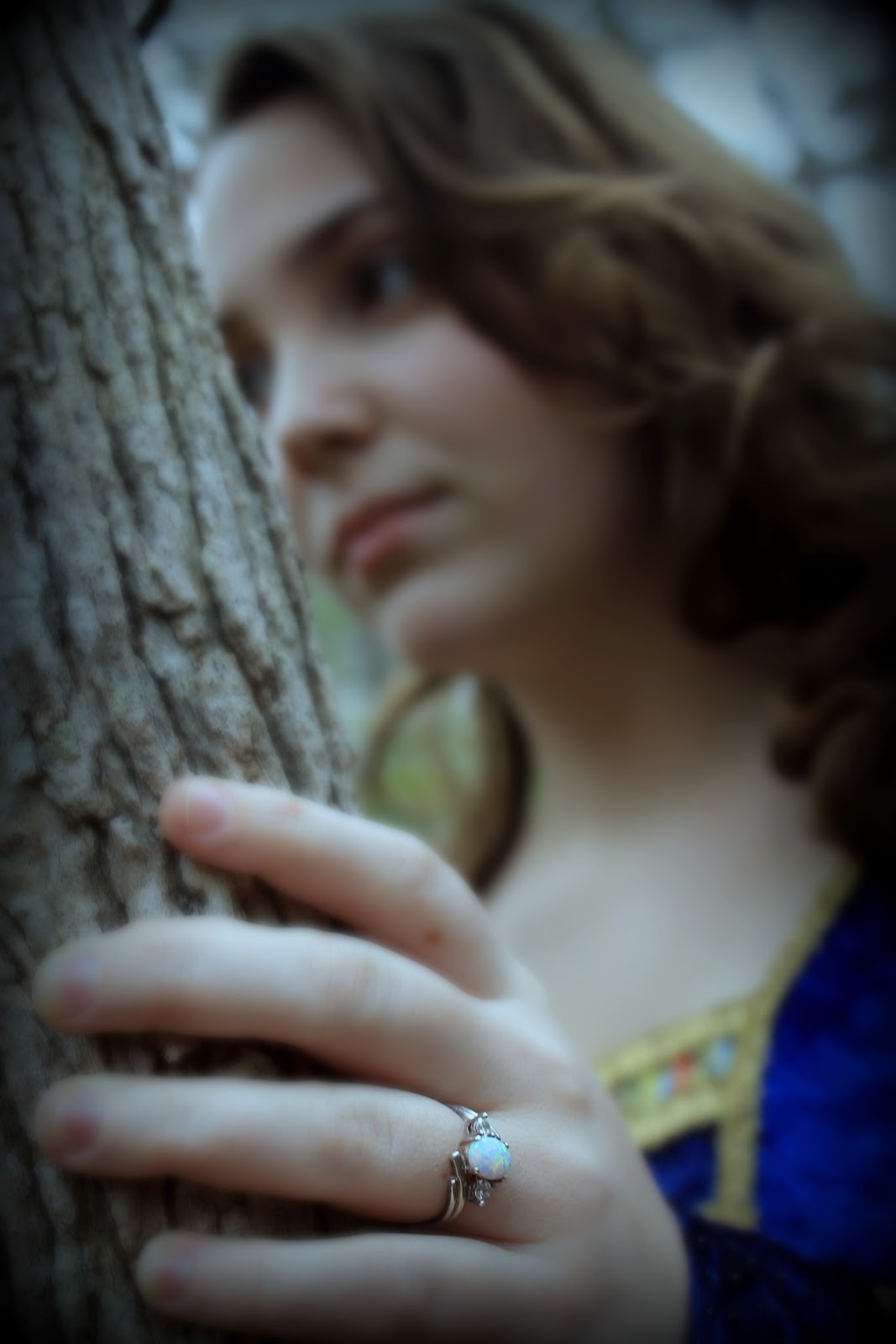 I described the ring to look like one that mygrandmother gave me. That's a picture of it up there . . . not very good quality picture, but you get the idea. Isn't it pretty? I don't wear it too often since opals are soft stones and too-easily break. But I still really like it!Here's another opal ring, modeled by the lovely Clara in a Heartless photo-shoot.