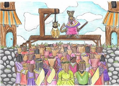 nawalked through the colourful village, her husband by her side. As they came to the town square they saw a gathering of cats and in the centre was a wooden stage with steps on its left. There, in the middle of the stage, was the emperor and beside him was Eanrin ready to be hanged! Una rushed toward the gathering but was stopped by the mean faces of several guards. She watched in horror as the cord was pulled onto the cat's neck. She stared back to her husband a silent cry slipping through her lips. Then she heard her husband’s voice erupt in anger.