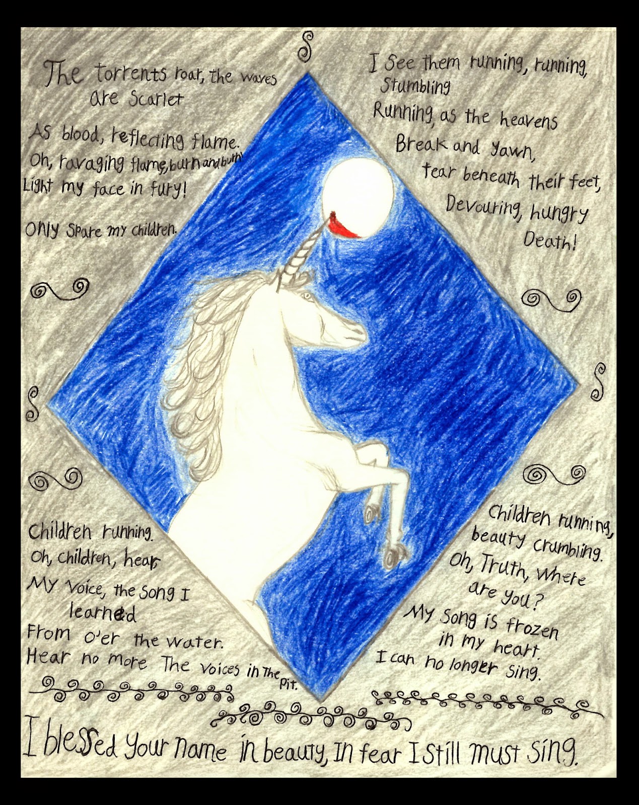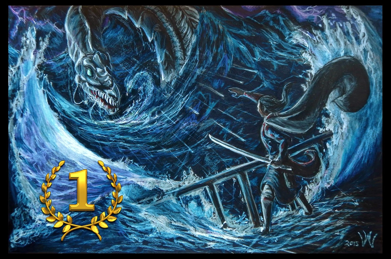 SUNAN CHALLENGES RISAFETHArtist: Hannah WilliamsMedium: Colored Pencil on Black PaperCongratulations, Hannah! A well-deserved win indeed! Could there possibly be a more epic, more energized, more terrifying and simultaneously beautiful illustration? I think not! I am as breath-taken by this image now as I was the first time I saw it. Your striking use of high contrast, the out-of-this world perspective created by the driving rain, the roiling action of the water, and the characters . . . all comes together into an image that truly merits that shiny gold medal.