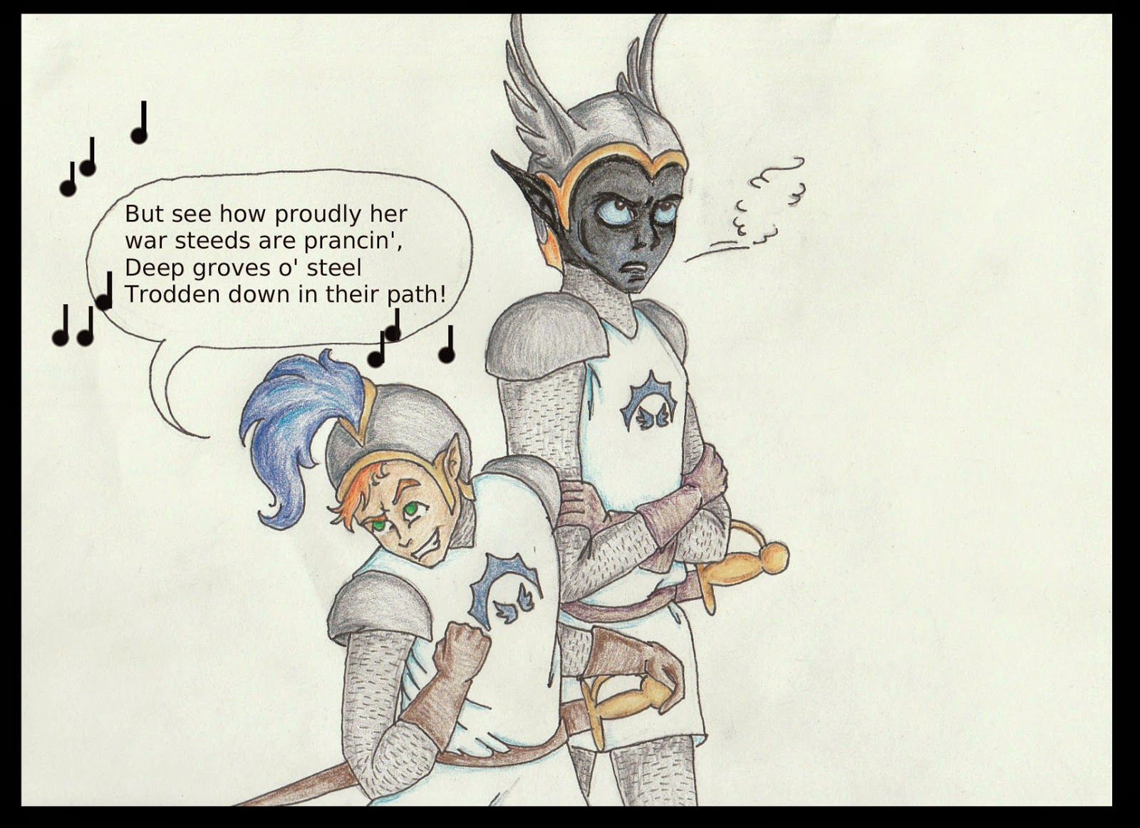Congratulations, Hannah! This image is a perfectly wonderful depiction of the Haven Library. And how adorable to see a scene from Dame Imraldera's daily life as she labors at her eternal task, only a little distracted by the attention-seeking Bard Eanrin. And Eanrin gazes at the lovely dame with such admiration . . . though she remains apparently oblivious! Your attention to detail is superb, your use of color gorgeous, and the characters look exactly as I would picture them. This is an image I want to frame and put right up on my wall!