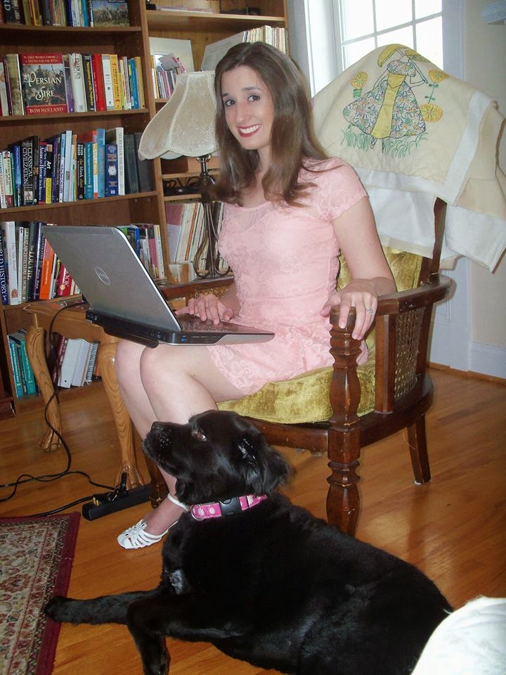 I don't have a great picture of the quilt,but you can see it behind me here in this photo.It's the cutest pattern of ladies-in-bonnets, holding little parasols. (Don't you love how Milly and I are wearing our matching pink, too?)Another project Mumsy helped me with was my new author photo! That's right, Imps. I have finally updated from my debut-author-in-her-earl-twenties photo to a grown-up-author-in-her-late-twenties photo. Mum helped me with makeup and hair (and picking out the outfit . . . plus she loaned me a fantastic necklace), and came along to assist with posing as well. And Rohan was my photographer. Want to see how they turned out?