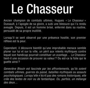 Combats ultimes et fantastique? C’est ce que nous réserve Geneviève Blouin dans son livre LE CHASSEUR (collection Nova, Éditions Les Six Brumes).