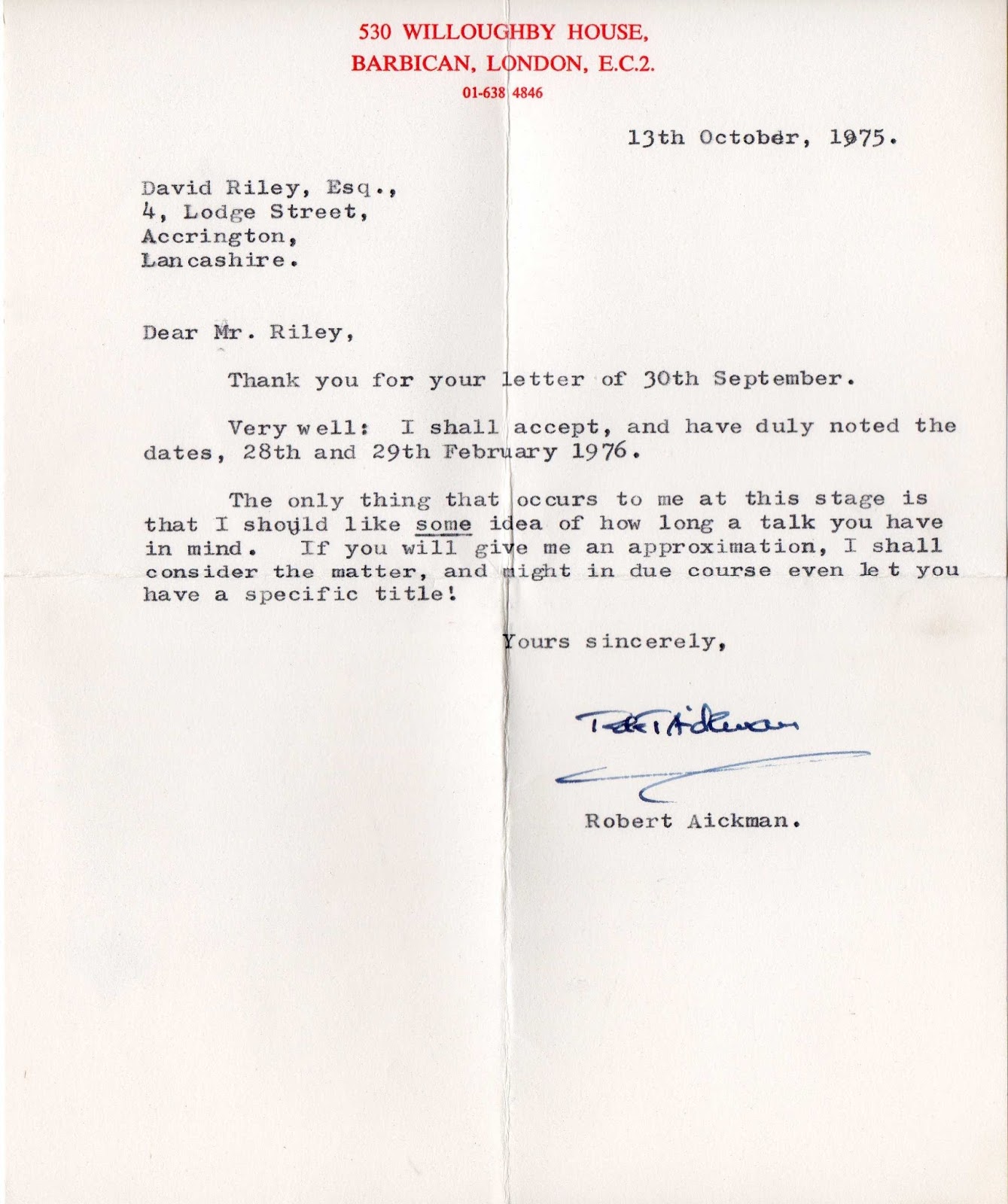 Robert Aickman's letter accepting the invitation to be GoH
