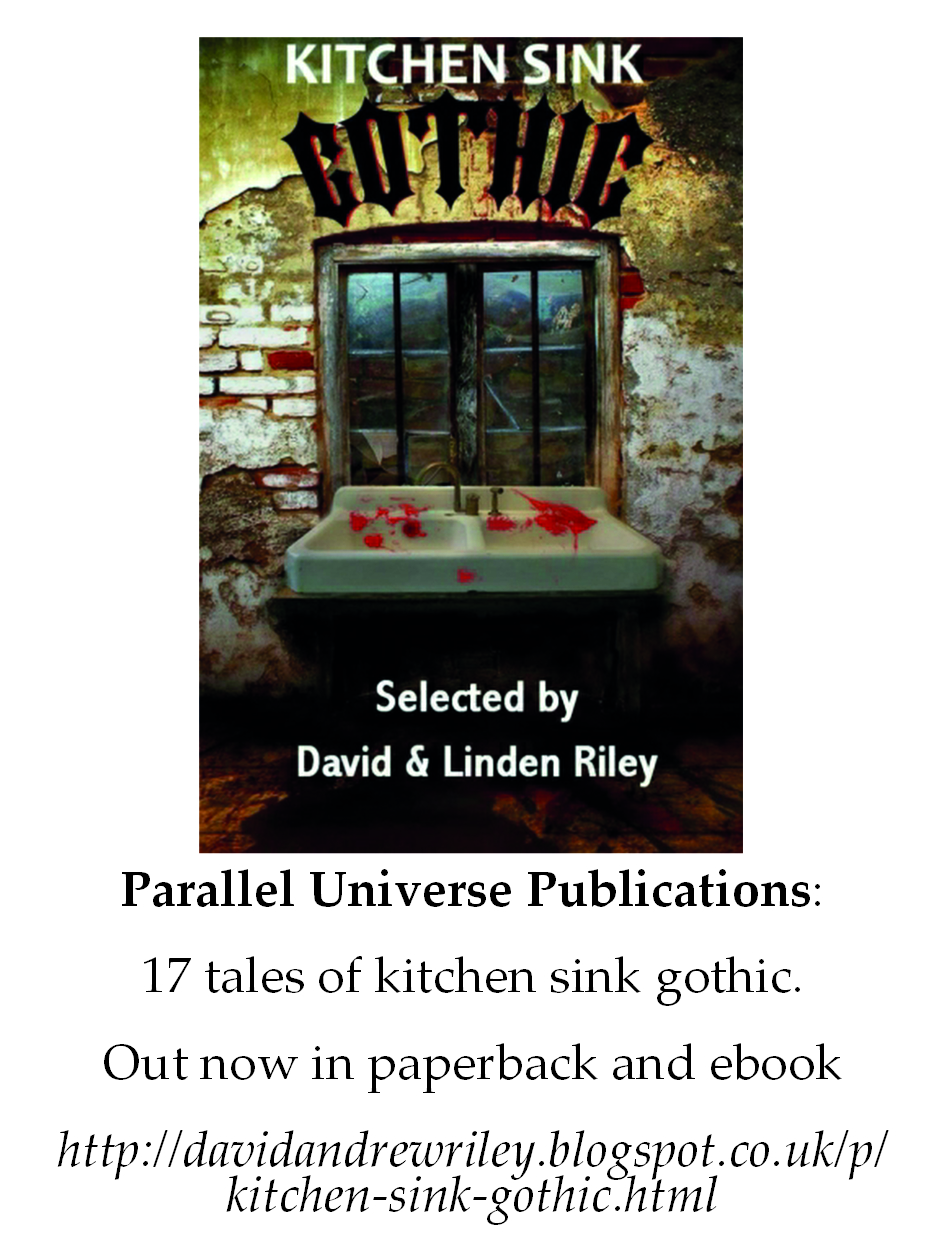 Coined in the 1950s, Kitchen Sink described British films, plays and novels frequently set in the North of England, which showed working class life in a gritty, no-nonsense, “warts and all” style, sometimes referred to as social realism. It became popular after the playwright John Osborne wrote Look Back In Anger, simultaneously helping to create the Angry Young Men movement. Films included Saturday Night and Sunday Morning, The Entertainer, A Taste of Honey, The L-Shaped Room and The Loneliness of the Long Distance Runner. TV dramas included Coronation Street and East Enders. In recent years TV dramas that could rightly be described as kitchen sink gothic include Being Human, with its cast of working class vampires, werewolves and ghosts, and the zombie drama In the Flesh, with its northern working class, down to earth setting. In this anthology you will find stories that cover a wide range of Kitchen Sink Gothic, from the darkly humorous to the weirdly strange and occasionally horrific.