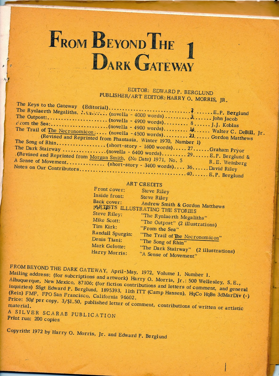 My first story published in the States was A Sense of Movement in 1972 in the fanzine From Beyond the Dark Gateway, edited by Edward P. Berglund. My story was illustrated by Harry O. Morris. The magazine was A4 in size with mimeographed text pages and semi-glossy lithographed pictures. It was published by Silver Scarab Press in Albuquerque, New Mexico, by the same people who already published Nyctalops.I rewrote my story some years later, expanding it from 3,400 words to 5,700, with a totally new protagonist. The new version was published in The Third Black Book of Horror in 2008.