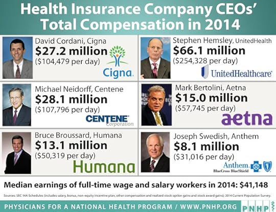 Note: the ''losses were in the hundreds of thousands for United Health Care (one of the biggest) in a quarter of 2015. They didn't like that...so they took their business and ran away. But just try to find out how much the top dogs get paid and you'll see just how the company is suffering! Oh, look...I did it for you. How do these 'guys' sleep at night? How indeed.