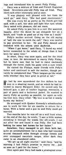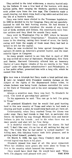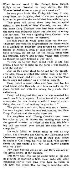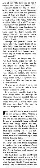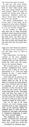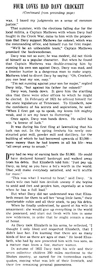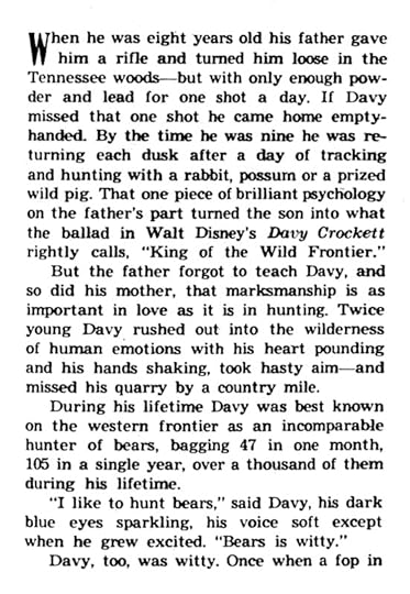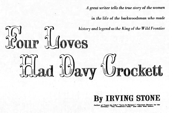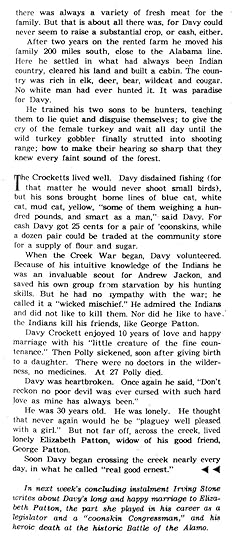 Back in 1955, the Crockett gravy train was going so strong that even novelist Irving Stone jumped on board. This was five years before The Agony and the Ecstasy, but among his already published books were historical treatments of Andy Jackson and his wife Rebecca, and Abe and Mary Todd Lincoln. This piece appeared in the newspaper supplement The American Weekly in three installments, beginning June 5, 1955, and was advertised as "Davy Crockett for adults." (I posted this in its original format a few days ago, but the tiny type pained my eyes, so I'm presenting an easy reading version here.)