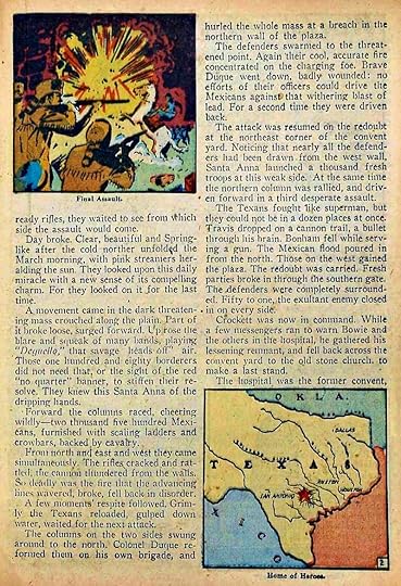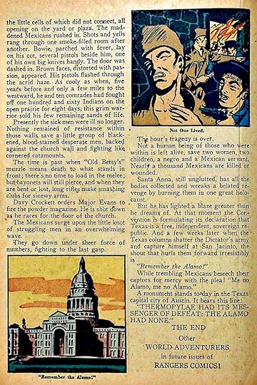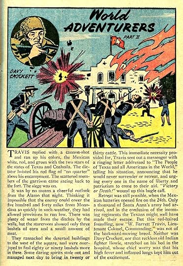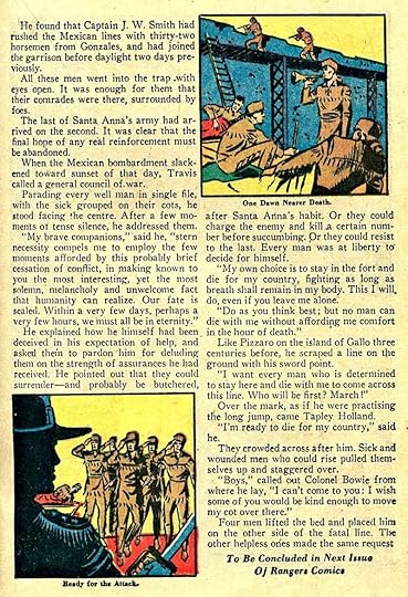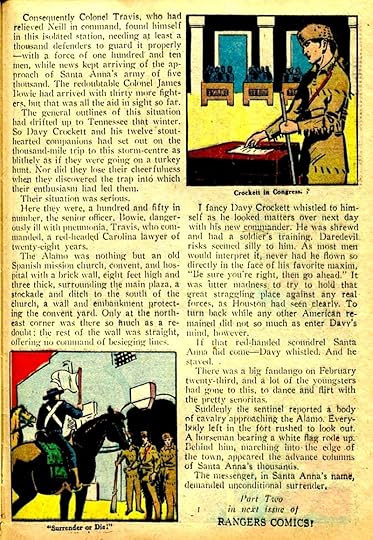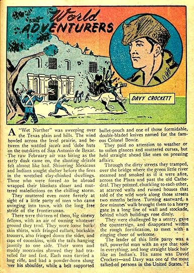 This feature appeared in three consecutive issues of Rangers Comics, beginning with #46 in April 1949. It offers a brief sketch of Davy's Indian fighting and Congressional career, then focuses on the Alamo. It's not too bad, considering the state of Crockett and Alamo scholarship at the time, which was really in its infancy.