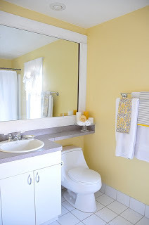 So, you can imagine the look on my dad's face when he got wind of the fact that I was planning on framing my bathroom mirror with crown molding. He started throwing around words like "mitre saw" and "math" and I just nodded along like I was in complete agreement with his super complex plan that involved tape measures and special saws and a lot of work. And then I went home and slapped up that crown molding using some glue I bought at Lowes. No mitre saws or fractions necessary. A little glue, some hammering and voila - an upgraded mirror.