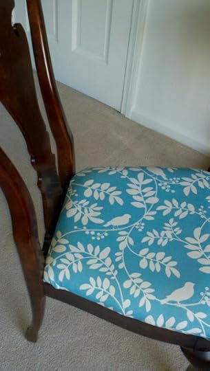 I'm in the process of recovering my dining room chairs with this fabric. It's a Dwell Studio outdoor canvas that was 50% off at Joann Fabrics. Super cute, bright and even better, stains will wipe right off.