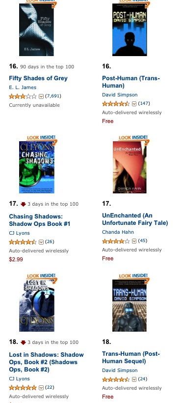 Post-Human and Trans-Human reached #16 and #18 respectively in the entire Amazon.com free Kindle store, with over 21 000 ebook downloads in just 48 hours! This brings the total of downloads for the series to 54 000 in 2012!