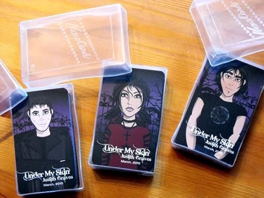 Character Cards: Val Cox (http://www.valcox.ca/) illustrated Under My Skin and her gothic work looks GOREgeous in full colour. After falling in love with her illos of the UMS crew, I asked her to develop some unique SWAG to promote the book. She came up with three different cards based on the main characters, their personalities and a quote from UMS. The cards are slick, hip and gothic – a great investment – worth the design and production fees. They also fit perfectly into the plastic, sealing bags used for the UMS chokers. Which brings us to….