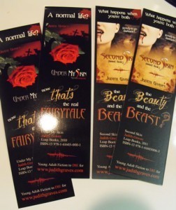 UMS Postcards: I had two separate designs created – one with the UMS cover and the other with one of the illos from UMS depicting the three main characters. I find the postcards most handy when mailing out ARC or prize winner copies of UMS – the large whitespace on the back lets me write a personal message. I had these printed at http://www.vistaprint.com/ – very affordable. At bookstores, these don't seem to move as quickly as bookmarks…