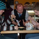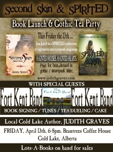 First up was the double launch and Gothic Tea party celebrating the release of Second Skin and SPIRITED. From the amazing boys of the Fort Kent Band, to Mr. Ryan Bailey – MC extraordinaire – complete with historically accurate “porkchops”, Mr. Graves for being a sport and sporting a top hat with goggles, a ray gun and a pipe, the owners of our local indie bookstore, Lots-A-Books, in costume, the tea dueling, and the great turn out of people into the SKINNED series. Bonus – the arrival of fellow SPIRITED contributor, Dawn Dalton to help me sign copies!