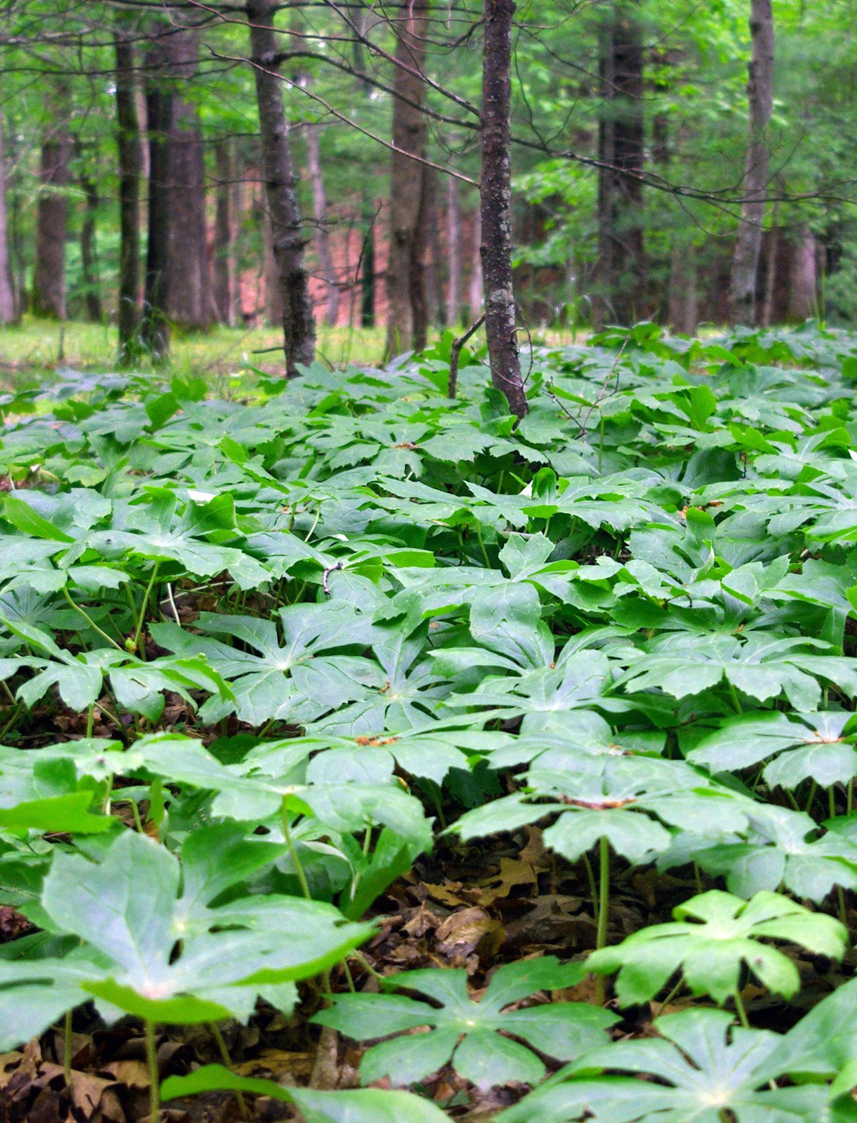 These May Apples (Podophyllum peltatum) erupted from the forest floor in April, bloomed their single white flower in May, and now their tiny fruit (see bottom picture) will steadily grow and ripen through the summer.