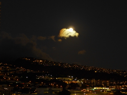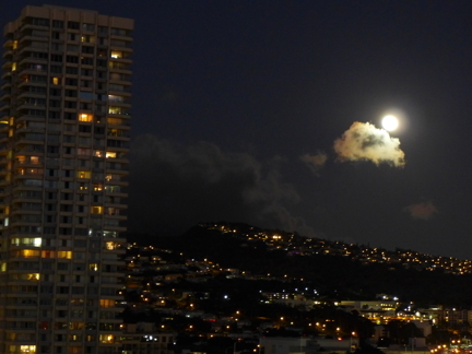 Second, it always rains over the Koolau's at night, this one being no exception. I tried my best to tease Supermoon to peek out of the clouds when moonrise over the mountains finally occurred, and, as you can see, it did. That's what I call real mooning.
