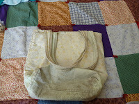 The writing bag then...I loved my old writing bag. Loved it! My sister made it for me. I loved the soft yellow fabric, the cheerful daisies, the mint green interior. I loved the many pockets and the large space inside. I loved it so much that I loved it to death. The handles are threadbare. They are coming unstitched from the top of the bag. There are holes in the bottom corners. I knew it was time for a new bag.