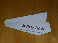 First off, I'm running a little promo on my Facebook page. When I get to 200 likes (or maybe even sooner, since I'm way excited), I will send out a paper airplane Avenging Angel to anyone who wants one.