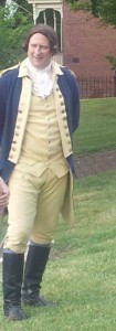 St. John’s Episcopal Church is on Church Hill, a lovely spot in Old Richmond. When you step into the gates, there’s not much to clue you in that it’s not the 1770s. I had always pictures a big brick church, but instead, it’s a lovely, small, white country kind of church. Inside, it’s just delightful with very upright, narrow pews with doors, beautiful tall windows, some stained glass and some plain, and “I am the way, the truth and the life” arched over the back wall. While we were waiting for the re-enactment to begin, the organist played and the attendees sang a selection of patriotic songs like the songs of each branch of the services, God Bless America, and the Star-Spangled Banner. I would have preferred that they stick to the patriotic hymns instead of the service songs, as good as those are, since we there on Sunday in a church building, though, of course, it wasn’t a worship assembly. “America, America” would have been a fantastic addition to the presentation.