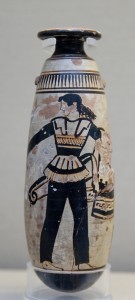 Image courtesy of Marie-Lan Nguyen. It is a photo of a ca. 470 BC Attic Greek alabastron showing an Amazon wearing trousers and carrying a shield.