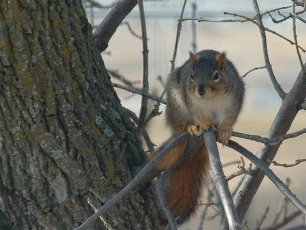 You might notice on the left there is a rather skeletal looking tree. I'm sure it'll be infested with leaves in a few months, but for the time being, it's fallen victim to the cycle of the seasons and the evil cold of the midwest. It's not just an idle, barren tree, though.For the most part, it just sits there quietly in the yard, but it also happens to be populated by--