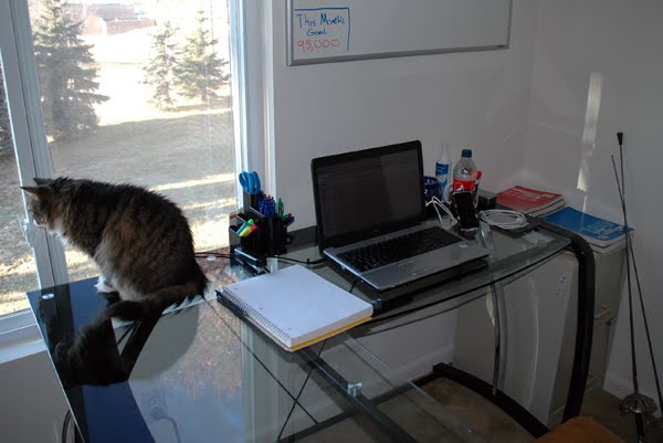 You'll notice Midget looking very interested in something that isn't my office. That's because we have a bunch of fat gray squirrels in the backyard, and they fascinate her. (I'll get pictures of them eventually -- every time I break out the camera, they disappear)Watching squirrels are srs bznz...