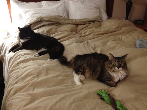 So then of course I also put my comforter over the bed to prevent incriminating cat hair from materializing on the hotel's sheets. And what does Tubby do? Burrow under the comforter. *sigh*Oh well. We're all safe and relaxing in this very nice little hotel in Medford, and my bacon-fed world-traveled cats seem to have forgotten about the day's trauma: