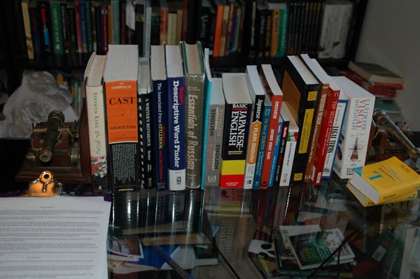 And here's some books that have a more or less permanent residence on my desk, though some may eventually move to a bookcase (when there's room):