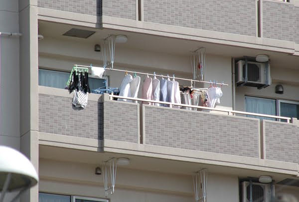 Onward. This is something I've been meaning to photograph, and finally remembered today. Space is scarce here, and electricity is expensive as hell, which makes drying clothing a bit of a catch-22. The Japanese, however, have no difficulty conserving both space and electricity while drying their clothes: