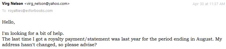 Begging for my moneyBut mostly, I was angry. Infuriated they turned what was a big moment for me... what I was so excited about... into something that made me twitch each time I saw their company name pop up on my social media. Into something that made me ashamed for being a fool.You see, they randomly decided to stop sending me my royalties. The last payment I got was in 2015 for the period ending in August 2015. My emails inquiring about it were either ignored or otherwise blown off.