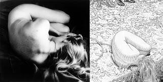 Hoy a la mañana vi el dibujo de Moebius, que aparece arriba, en el blog de Anders Nilsen. Luego, por la noche, mirando Facebook vi posteada esta foto de Imogen Cunningham (Phoenix on her side) en el muro de alguien. Nunca había visto ninguna de las dos imágenes. Es probable que Moebius se basó en la foto de 1968. Tal vez no. Este tipo de sincronismos me intrigan un poco.