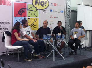 Dos fotos del Festival Internacional de Quadrinhos (comics) de Belo Horizonte. En la de arriba, esperando a que empieza la charla (foto de abajo) sobre "tiras". Estaba hablando con Paulo Ramos sobre Buenos Aires.